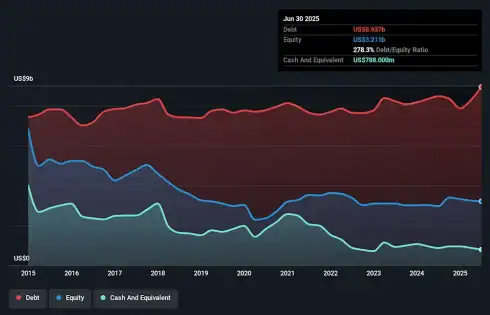 You can click the graphic below for the historical numbers, but it shows that as of June 2025 Illinois Tool Works had US$8.94b of debt, an increase on US$8.47b, over one year. However, it also had US$788.0m in cash, and so its net debt is US$8.15b.