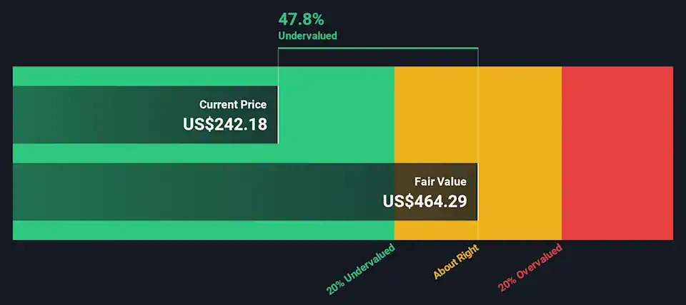 Aggregating and discounting these projected cash flows results in an estimated intrinsic value of US$613.82 per share, compared with the recent share price of US$152.53. On this framework, the DCF implies the stock trades at roughly a 75.2% discount to that intrinsic value, which in this analysis is interpreted as suggesting meaningful undervaluation on these assumptions.