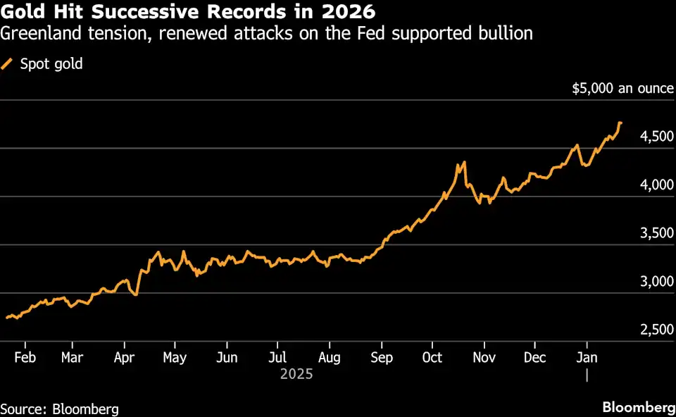 Gold extended its record rally as the crisis over Greenland and a meltdown in Japanese government debt supported haven demand.