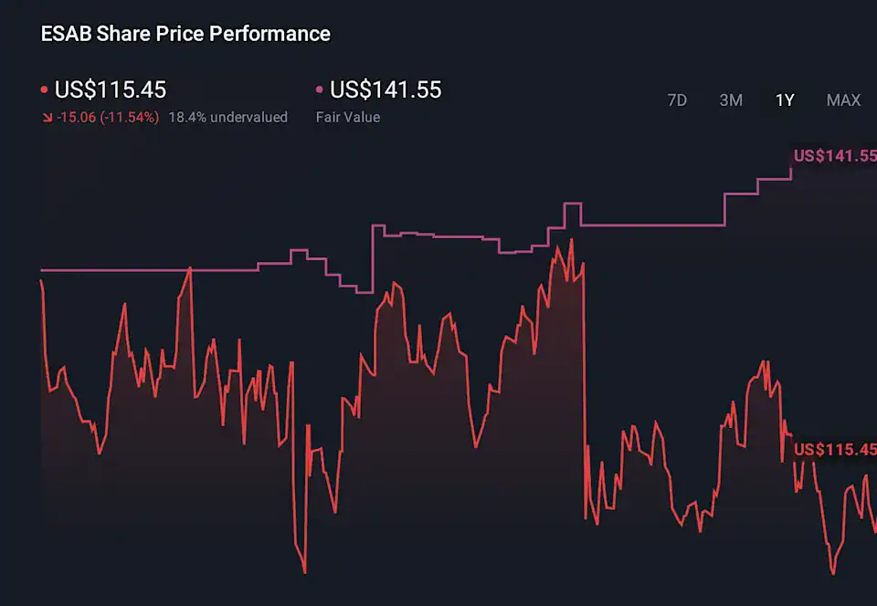 The latest update to ESAB’s modelled fair value nudges the price target from US$141.55 to US$143.00, paired with a slightly lower discount rate of about 8.75% and more restrained revenue growth assumptions of roughly 4.35%. That mix reflects how recent broker research is balancing confidence in the story with a bit more caution on the pace and durability of future expansion, rather than a simple bullish or bearish swing. Stay with this article to see how you can keep on top of these shifting assumptions and the evolving narrative around ESAB.