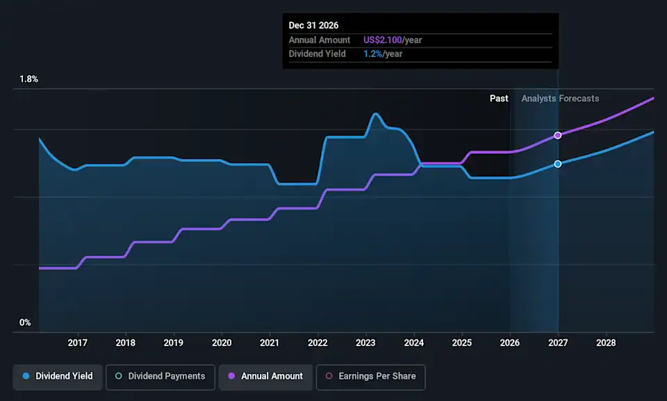 Over the next year, EPS is forecast to expand by 35.1%. If the dividend continues on this path, the payout ratio could be 28% by next year, which we think can be pretty sustainable going forward.