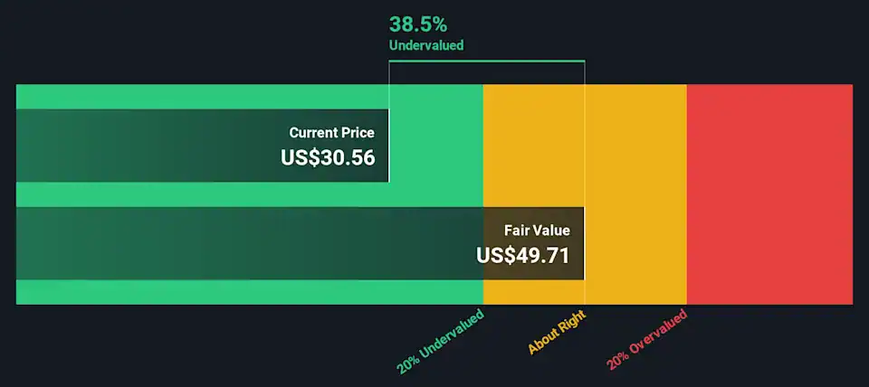 The total value is the sum of cash flows for the next ten years plus the discounted terminal value, which results in the Total Equity Value, which in this case is US$1.9b. The last step is to then divide the equity value by the number of shares outstanding. Compared to the current share price of US$30.6, the company appears quite good value at a 39% discount to where the stock price trades currently. The assumptions in any calculation have a big impact on the valuation, so it is better to view this as a rough estimate, not precise down to the last cent.